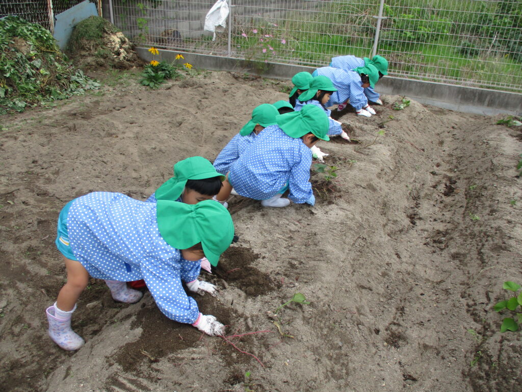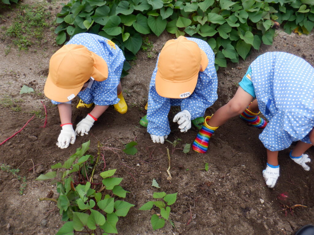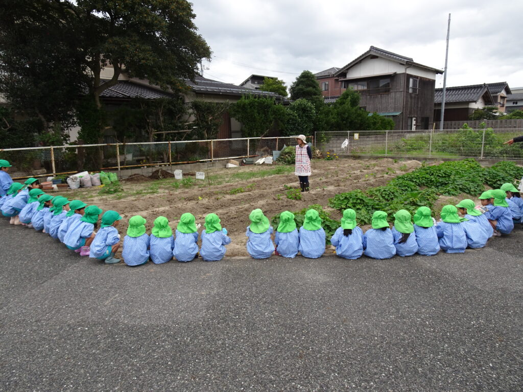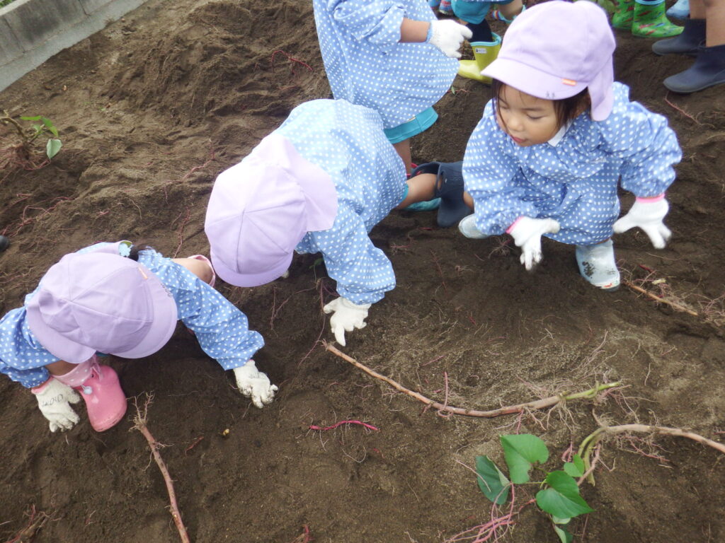 今日は、かもめ幼稚園の畑へみんなでさつまいも掘りに行ってきました。