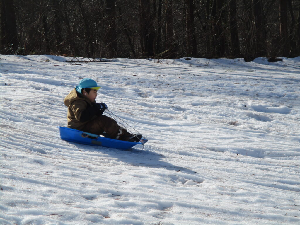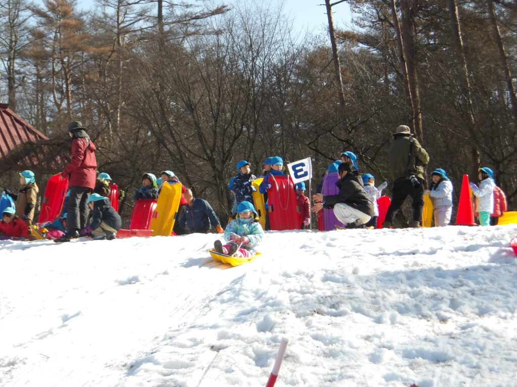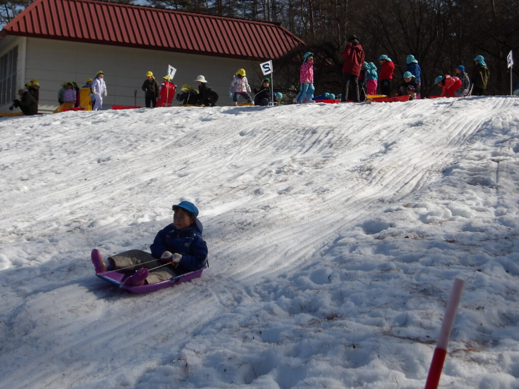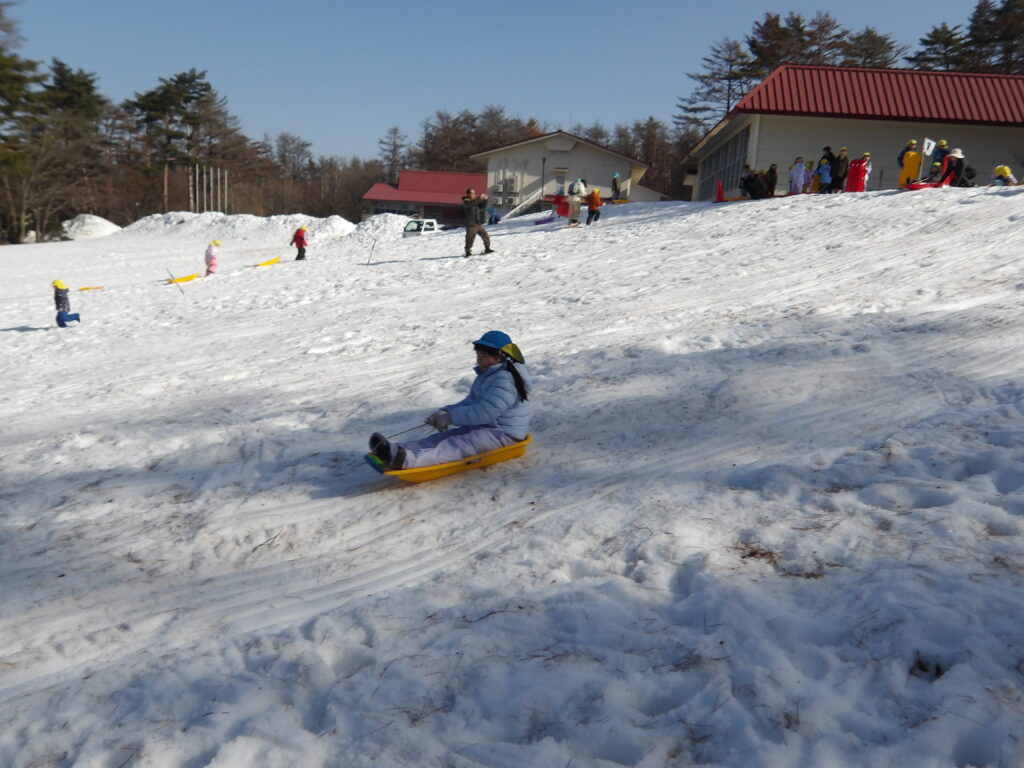 長い坂を勢いよく滑るそり!転んだりジャンプしたりすることもありましたが、「楽し~い」と何度も繰り返し遊びました。