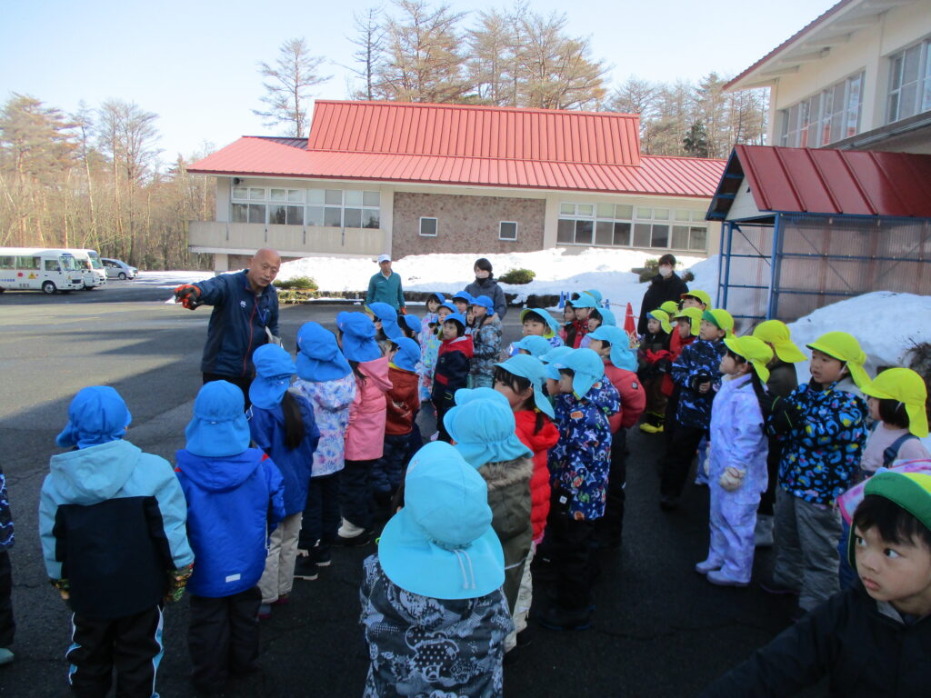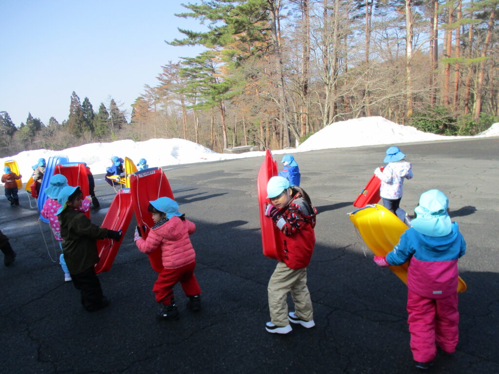 大山青年の家にそりすべりに行きました。一人ずつそりを運んで、そりすべりスタート!
