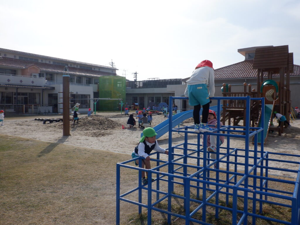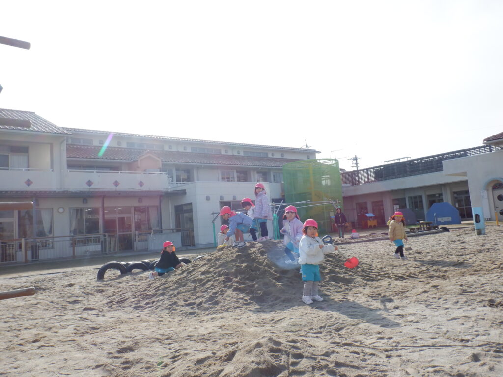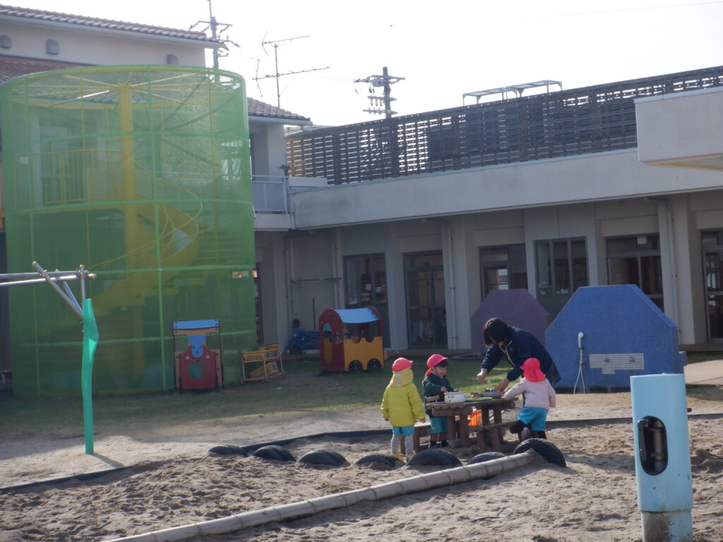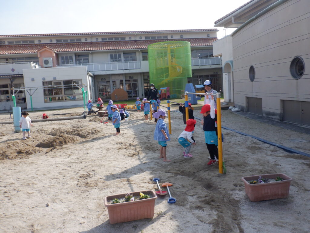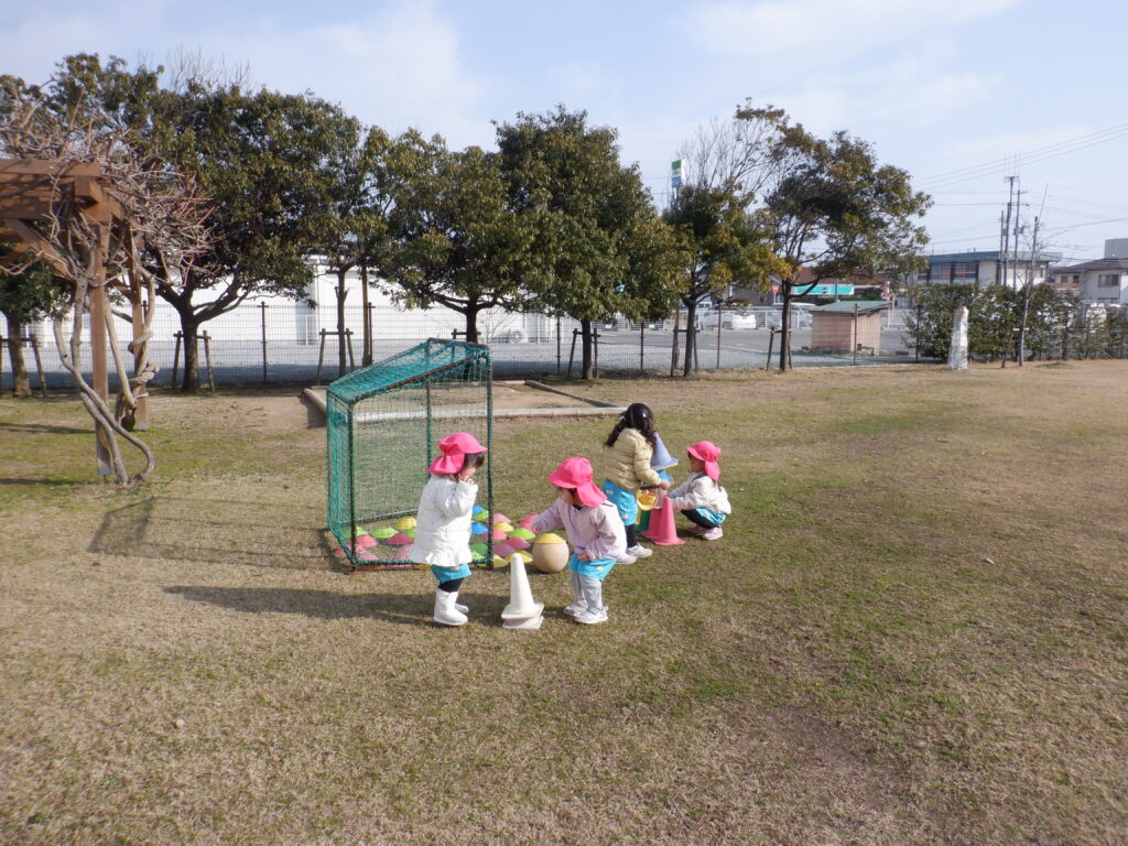 さっそく満3歳クラスが、外遊びを楽しみました。