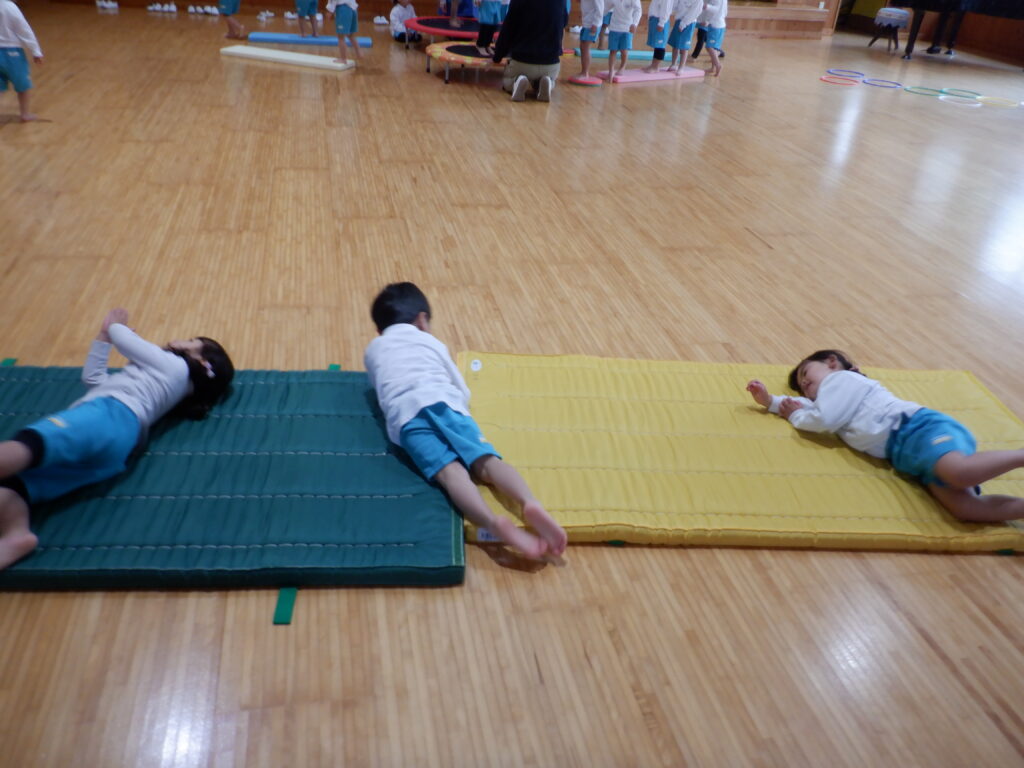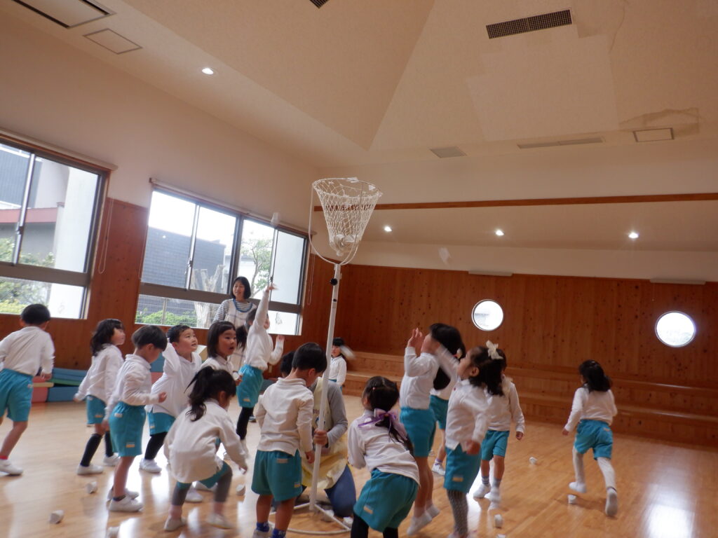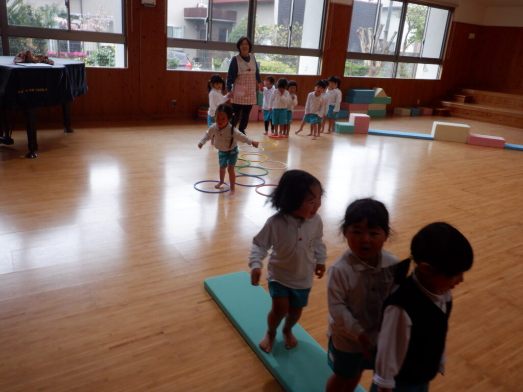今日は、弁当の日。 でもその前に… 満3歳クラスでは、おいしそうなごちそうが並んでパーティーの真っ最中です。 外は、雨。 でも、遊戯室は熱気にあふれています。 年中クラスは、玉入れを楽しんでいます。 どこのクラスが勝ったかなあ…。 年少クラスも、遊戯室で遊びます。 ジャンプをしたり転がったりして、動きづくりを楽しみます。 じゅんばん・じゅんばん。 きまりを守って、みんなで楽しく遊びました。 汗もかいて、お茶も飲んで、おなかがすいて、 楽しみにしていた弁当を、きれいにおいしくいただきました。