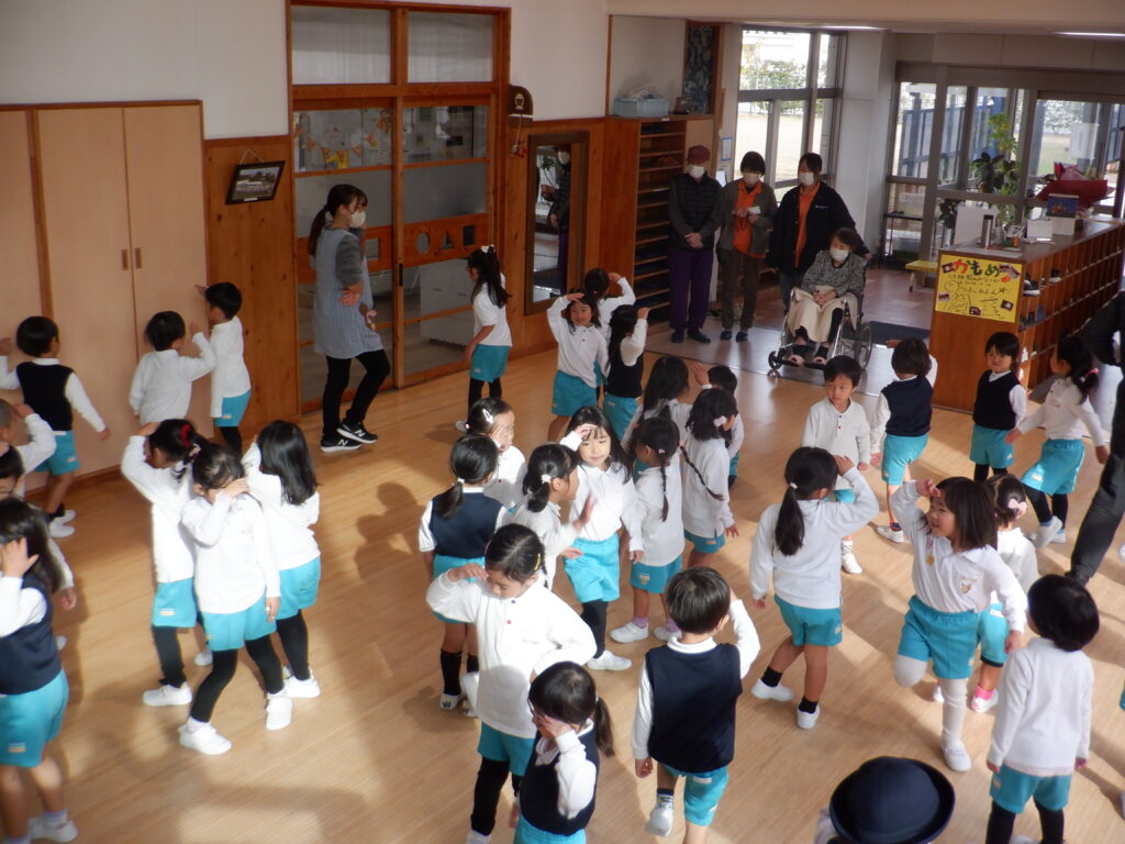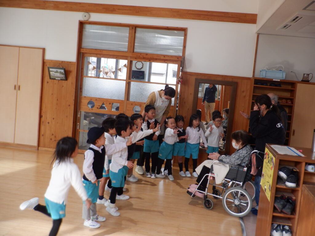 交流のある介護事業施設の利用者さんが、遊びに来てくださいました。 元気いっぱいの子ども達に、高齢者のみなさんも大喜びです。 子ども達も、ミッキー体操で大歓迎。 「今度は私達が行くね!」 弁当の前に、遊戯室でしっかり体を動かす子ども達。 お楽しみの弁当タイム。 あたたかい日差しの中で、ゆったりと弁当を食べました。 「おいしかったです!ごちそうさまでした。」 来週は木曜日と金曜日の2回弁当の日がありますが、よろしくお願いします。