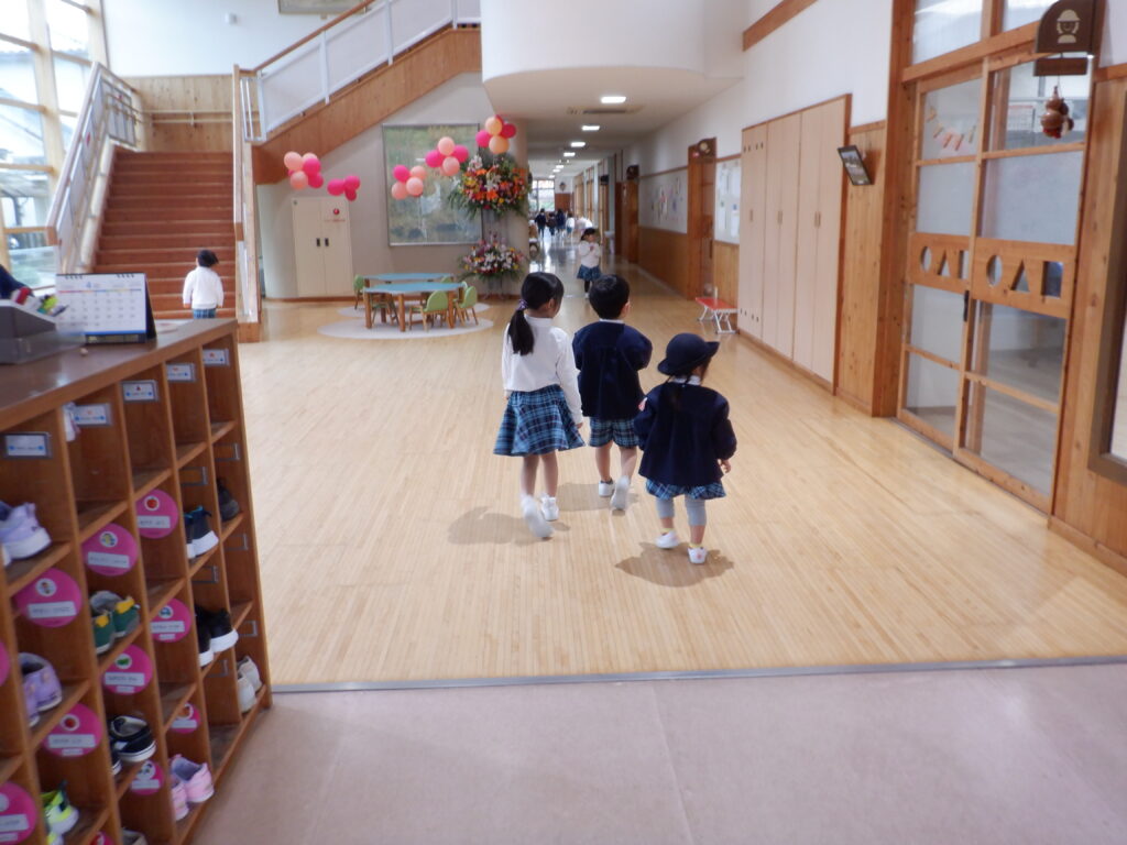 開園間もない、朝の幼稚園。 年長児さんが、張り切って玄関で待っています。 4月に入園したばかりの友達に、いろいろ教えてくれます。 カバンを持つのを手伝ったり… 部屋まで案内したり… たよりになる、年長さん達です。 階段の上り下りも、きちんと手すりを持って歩きます。 年長さん、ありがとう!