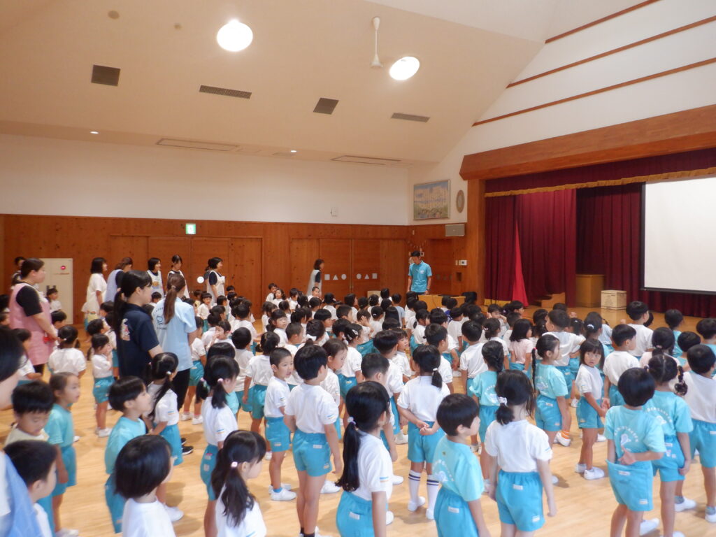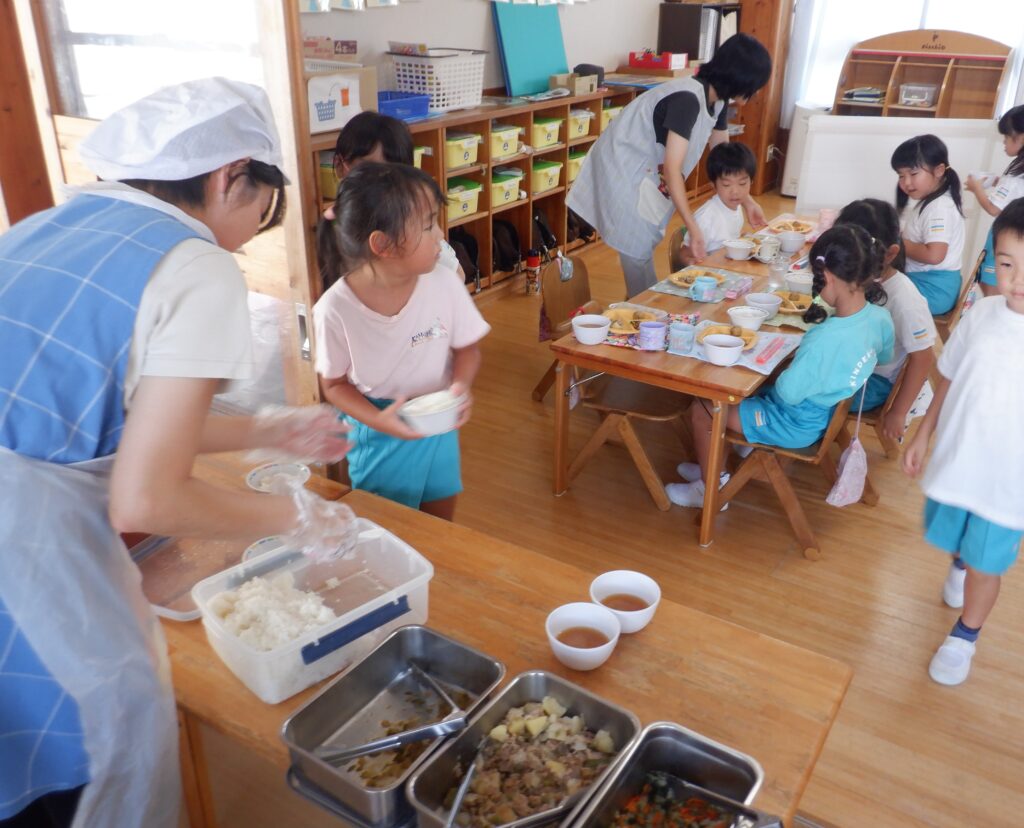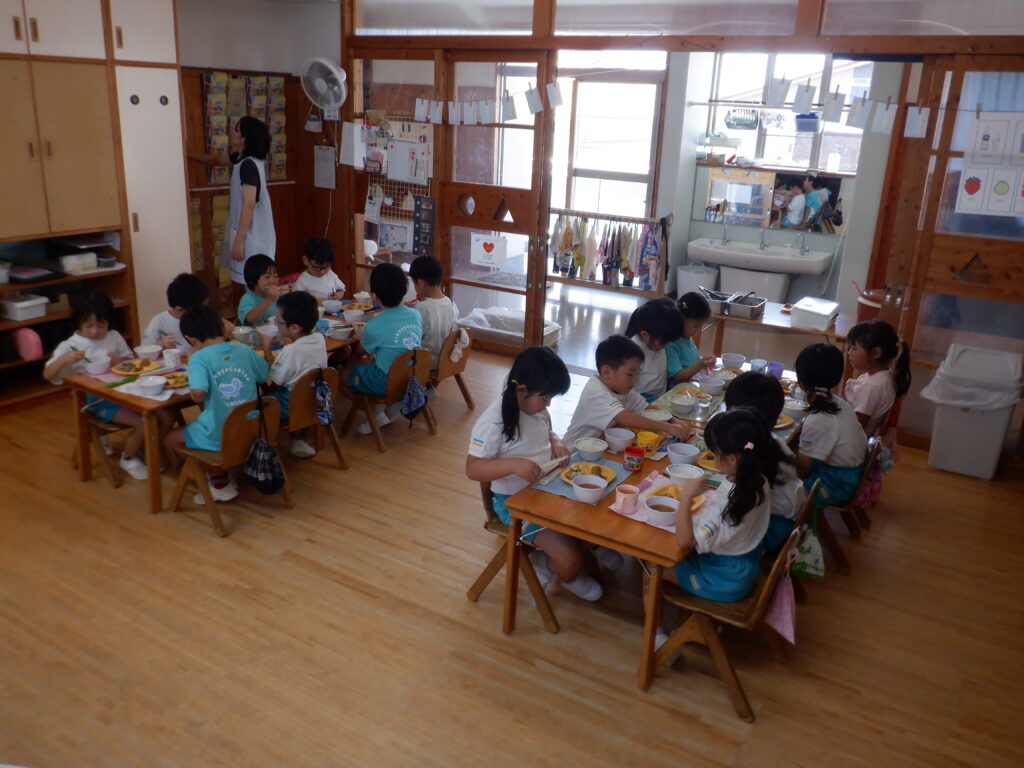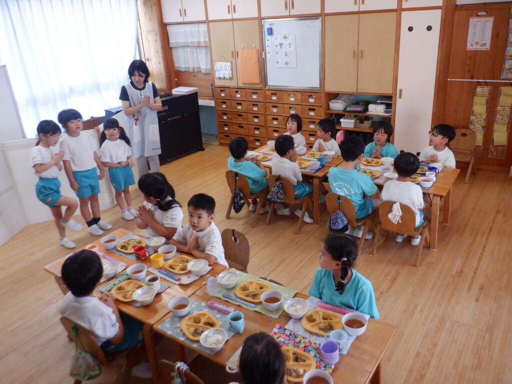 第2保育期の、始業式がありました。 いつもよりちょっと背筋も伸びて、みんな上手に並びます。 「かもめっこのうた」の歌声が、遊戯室いっぱいに広がりました。 今日は、久しぶりの給食です。 自分で食べられる量を、しっかり伝えます。 今日のメニューは何かなあ。 みんなそろって「いただきます!」 お腹いっぱいになって、みんなの笑顔が広がりました。