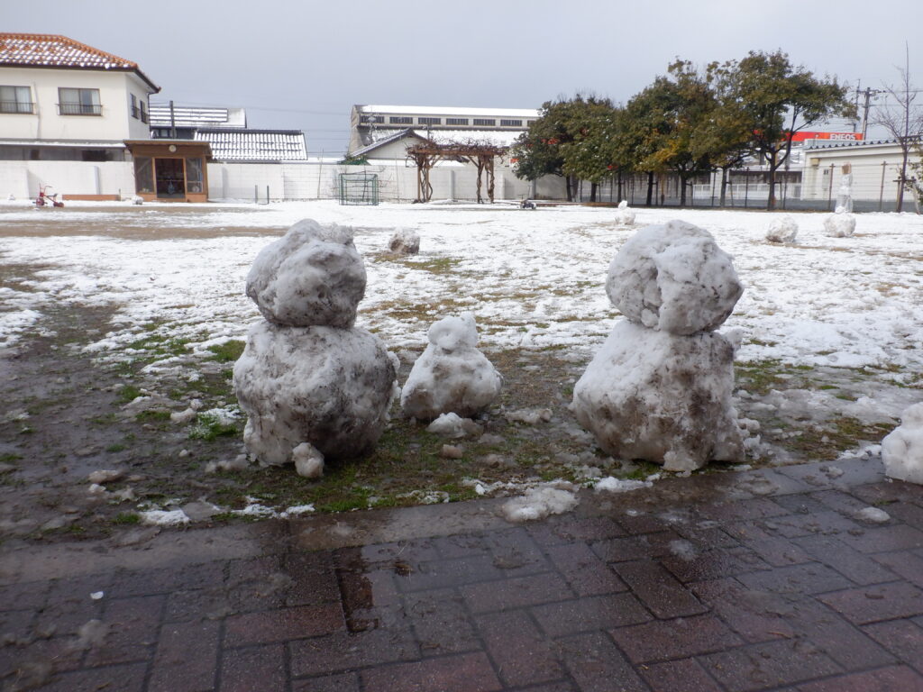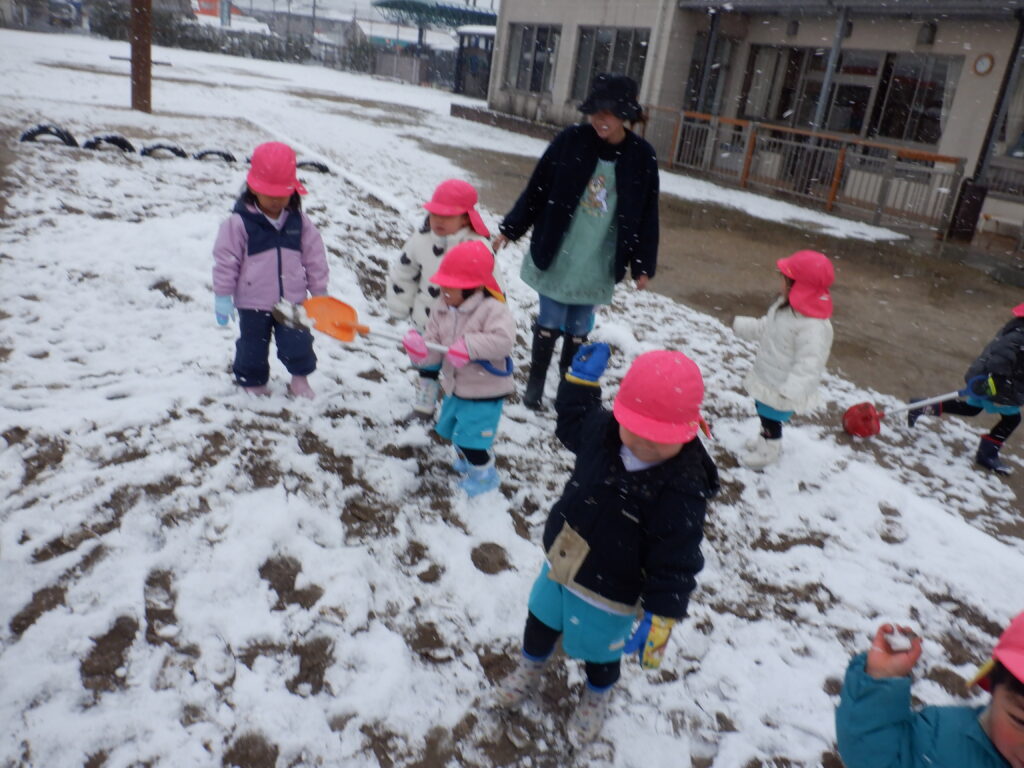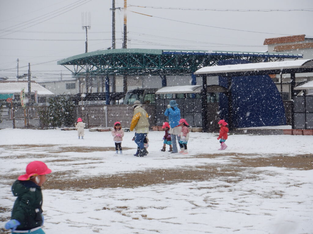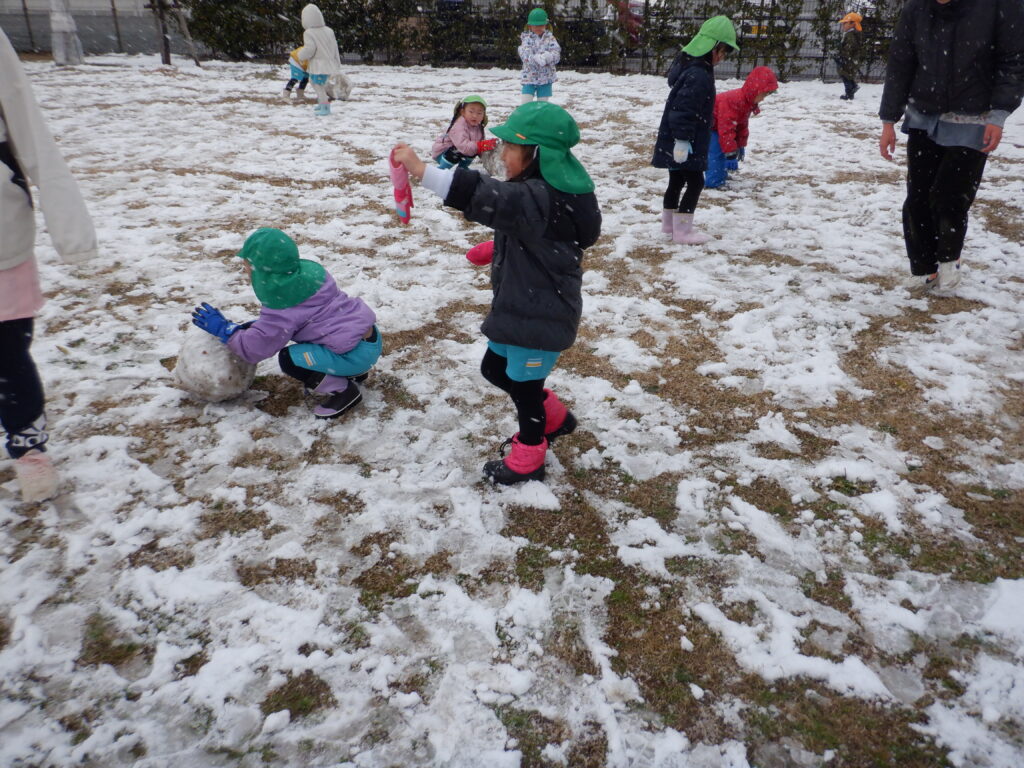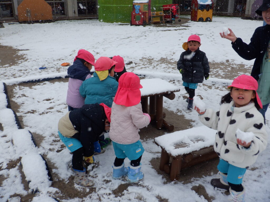雪がやんだ時を見つけて、子ども達が園庭に出てきました。