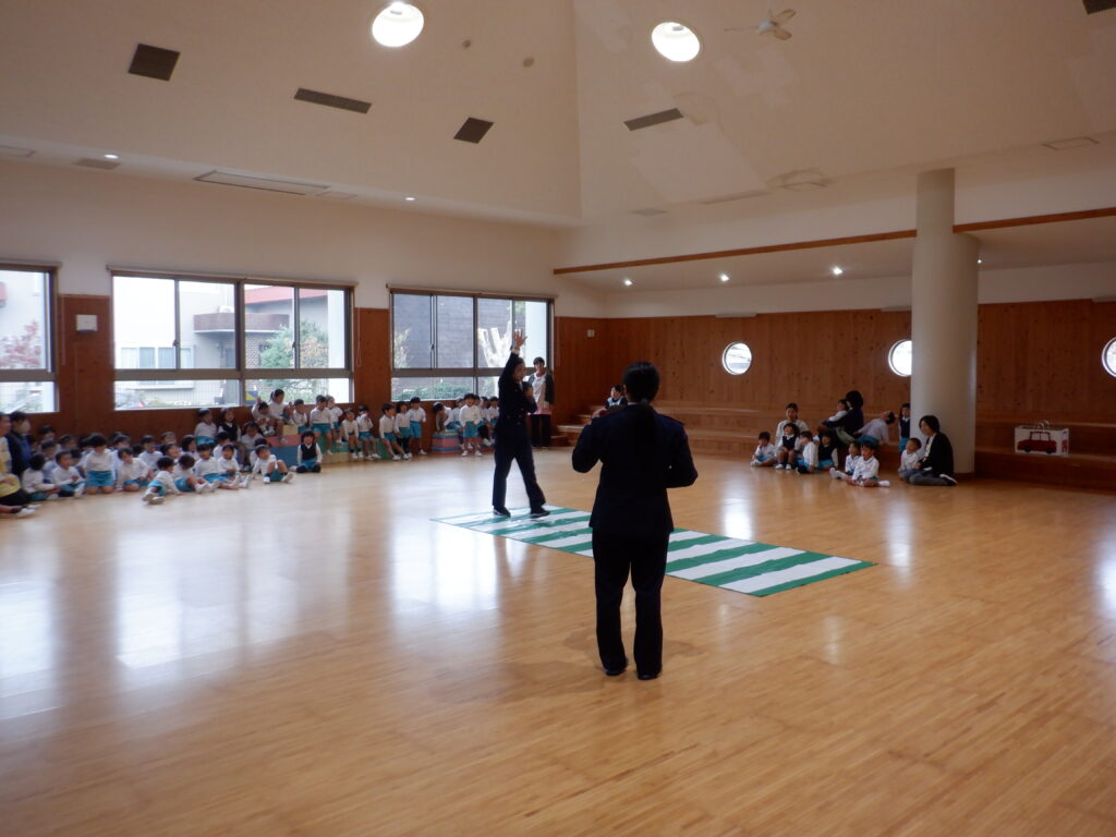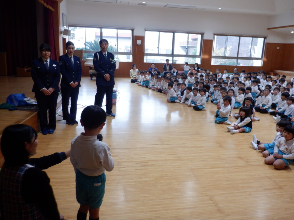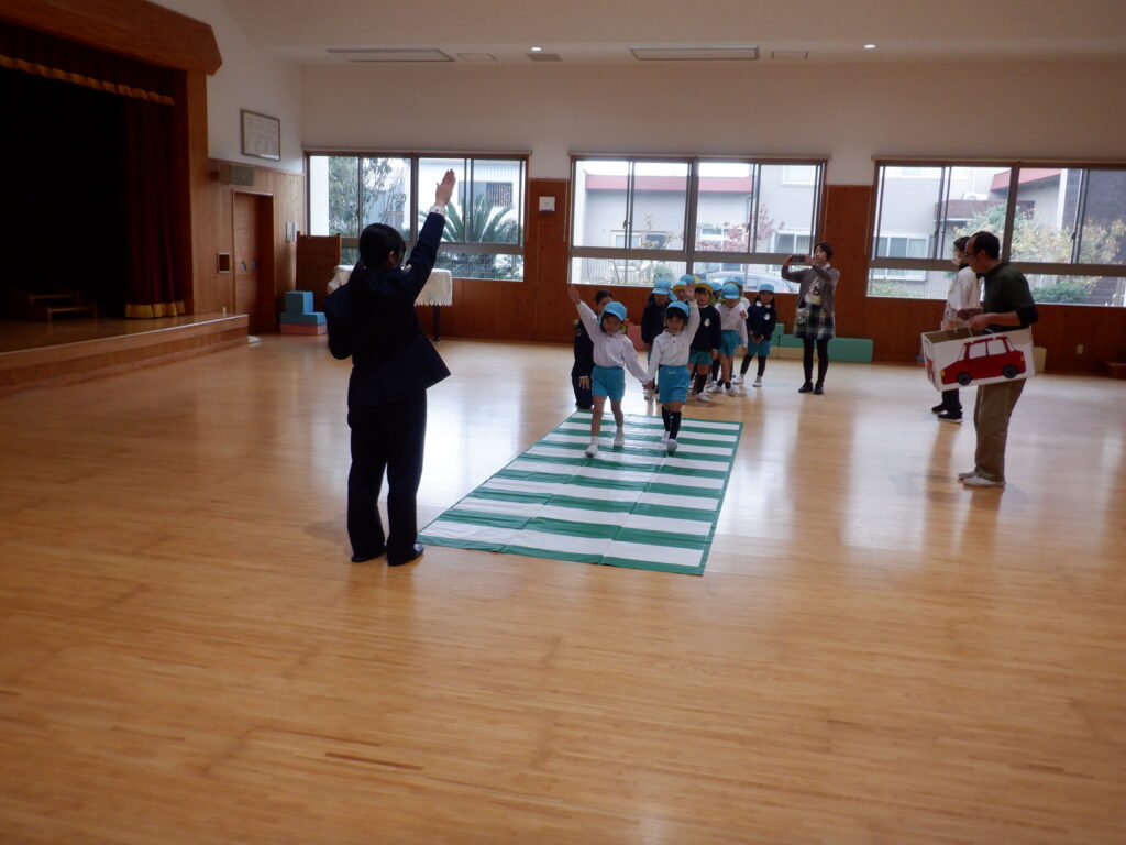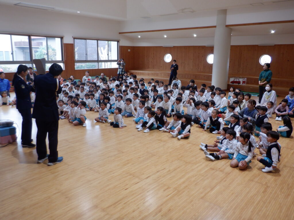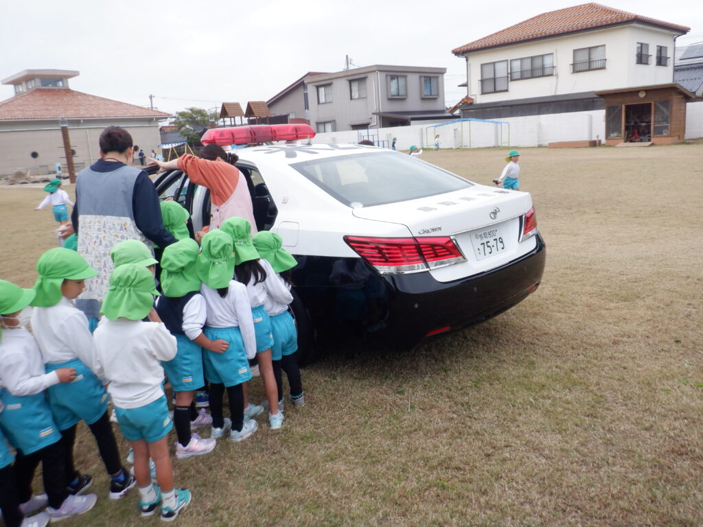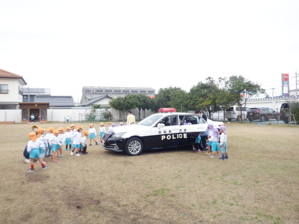 米子警察署のおまわりさんに来ていただいて、交通安全教室がありました。 代表の園児が、あいさつをします。 道路の歩き方や、信号の色の意味を教えてもらいました。 実際に、横断歩道を渡ってみます。 よく確かめないと、車が来ています。 園庭では、パトカーに乗せてもらいました。 憧れのかっこいいパトカーを間近に見て、子ども達も大喜びです。 みんなで交通安全を心がけていきましょう。 今日の様子は、アルバムコーナーにも載せています。
