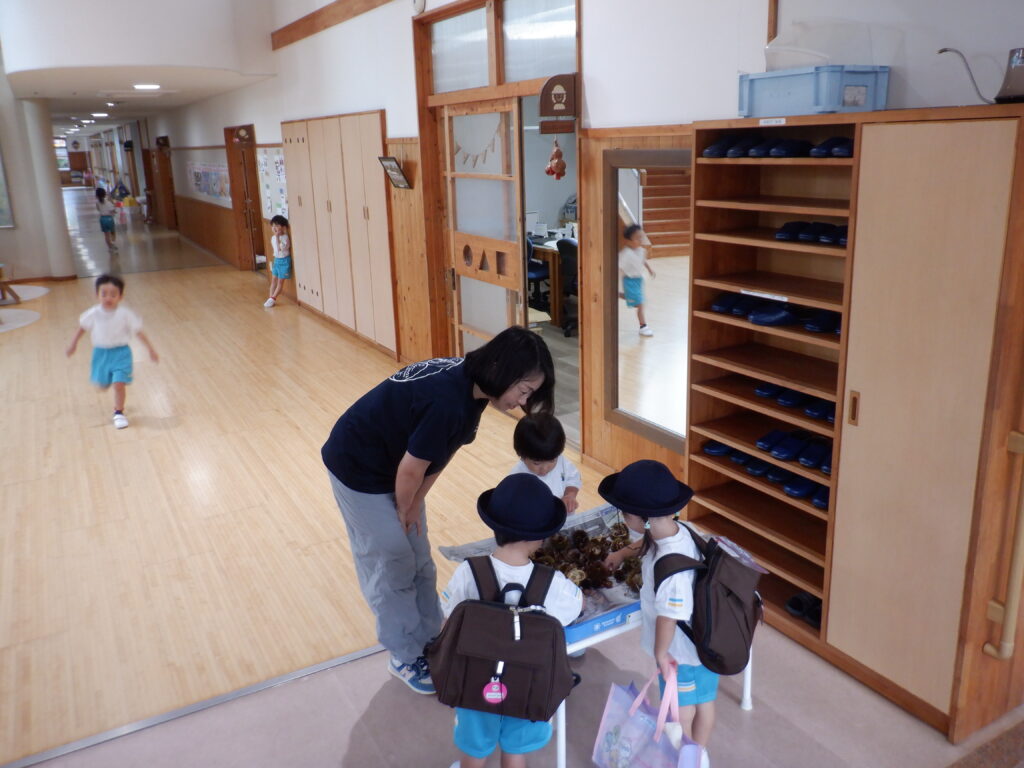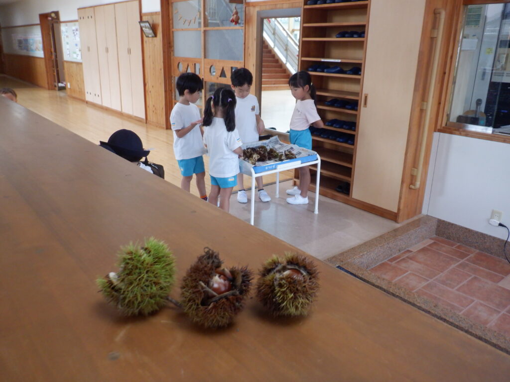 幼稚園に、栗がやってきました。 いがの中に入った栗に、興味津々です。 慎重に、慎重に、そっと触って… 「どんぐり?」 「おしい。栗でした。」 やっぱり、食欲の秋ですね。 運動会が、近づいてきました。 涼しくなって、応援するのも楽しくなりました。