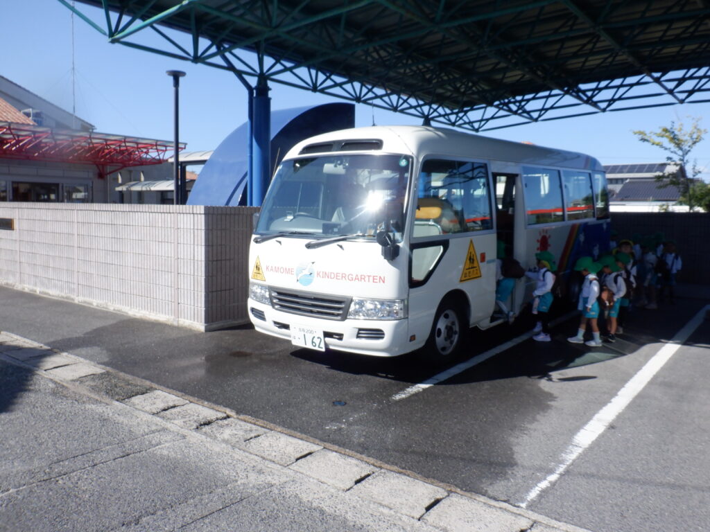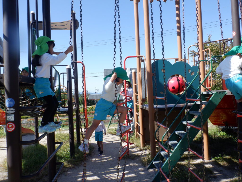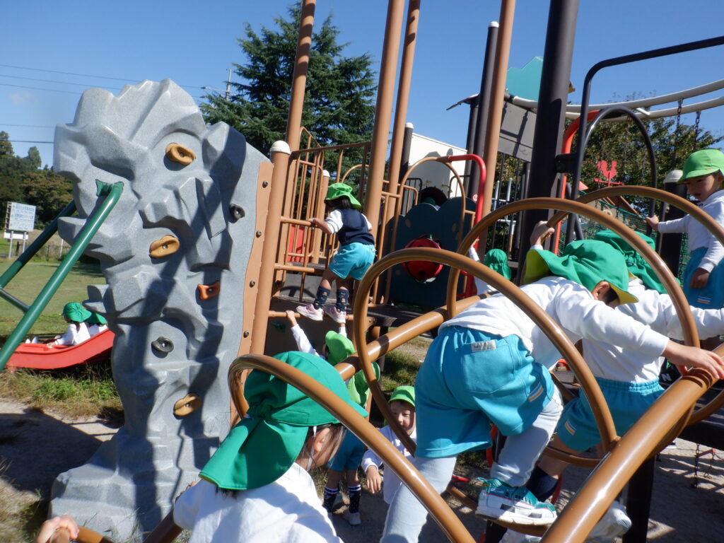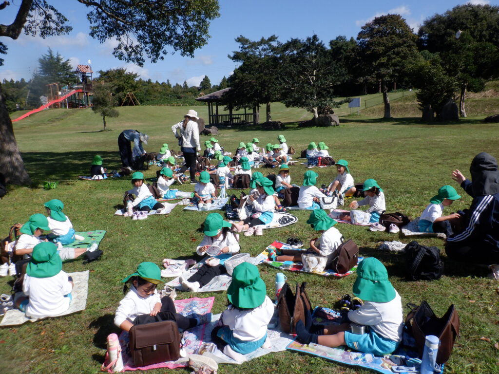 こんな日は、園外保育が似合います。 バスに乗って「レッツゴー!」 大山に向かって、進んで行きます。 READY GO! 幼稚園とは違う遊具で、みんな大はしゃぎ。 せまい所も 地面が見えても ゆらゆら揺れても どんどん進んで行きます。 最後は、迫力満点のすべり台。 みんな「ナイス着地!」です。 いっぱい遊んで、最高の一日でした。 クスノキの実も、たくさん落ちていました。 おいしいお弁当を食べて、 大満足の一日でした。