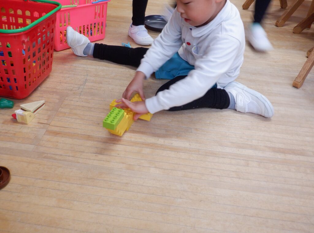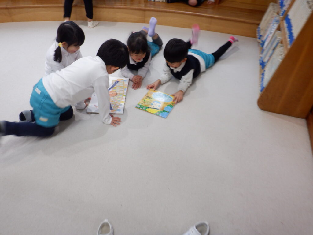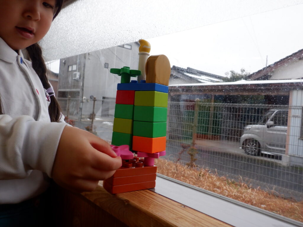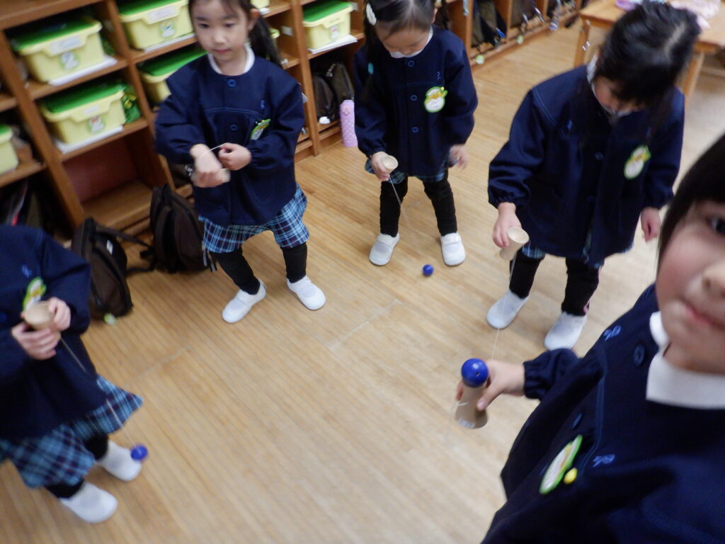 室内遊びも、楽しさいっぱい。 広告を丸める手つきも、慣れたものです。 年中クラスは、簡単けん玉が大流行。 年長クラスは、ひもを使ったコマ回し。 大きなレゴも、自由自在。 床の上でも 窓のそばでも、自由な発想が生まれます。 やっぱり読書は、ワクワクします。 帰る間際も、練習に励みます。 みんなの技術が、どんどん上がっています。