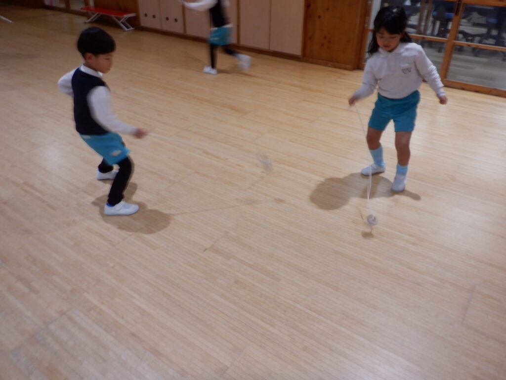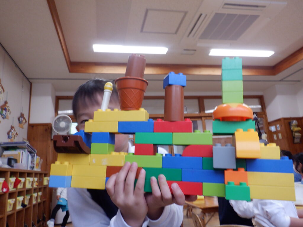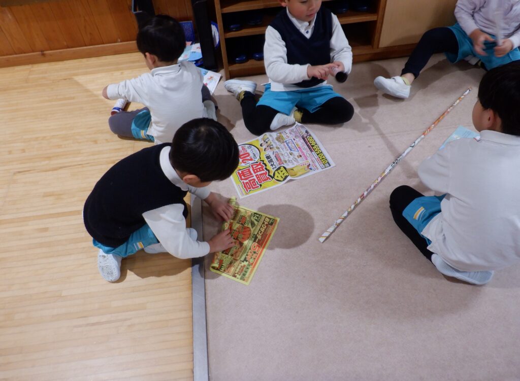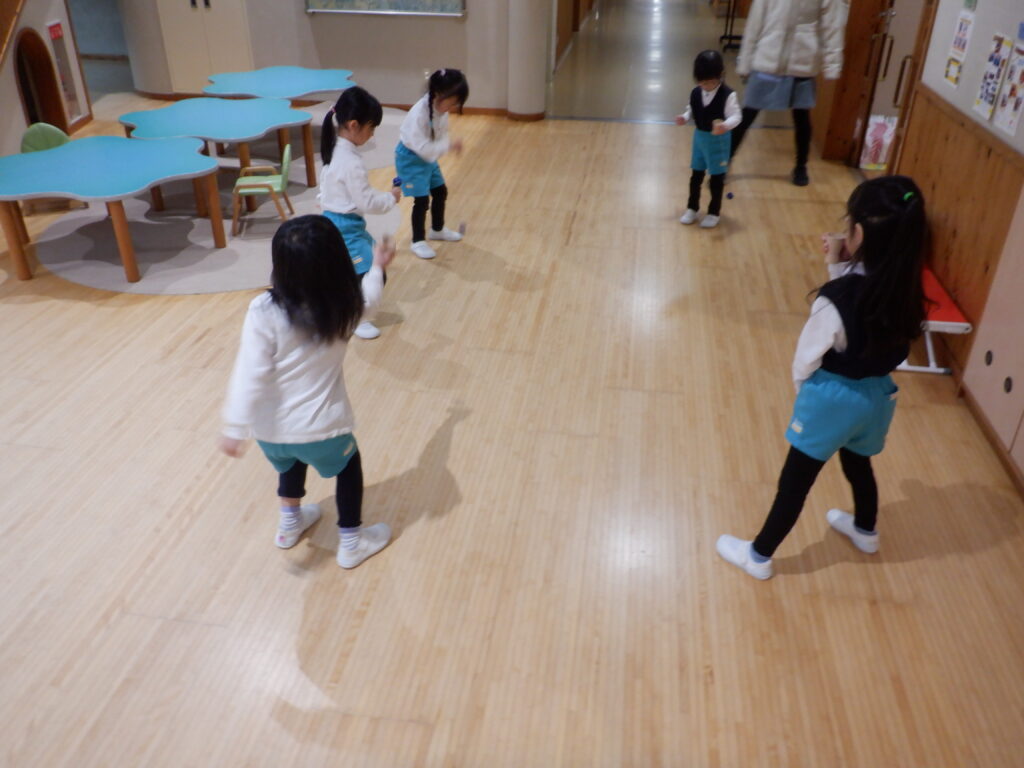 室内遊びも、楽しさいっぱい。 広告を丸める手つきも、慣れたものです。 年中クラスは、簡単けん玉が大流行。 年長クラスは、ひもを使ったコマ回し。 大きなレゴも、自由自在。 床の上でも 窓のそばでも、自由な発想が生まれます。 やっぱり読書は、ワクワクします。 帰る間際も、練習に励みます。 みんなの技術が、どんどん上がっています。