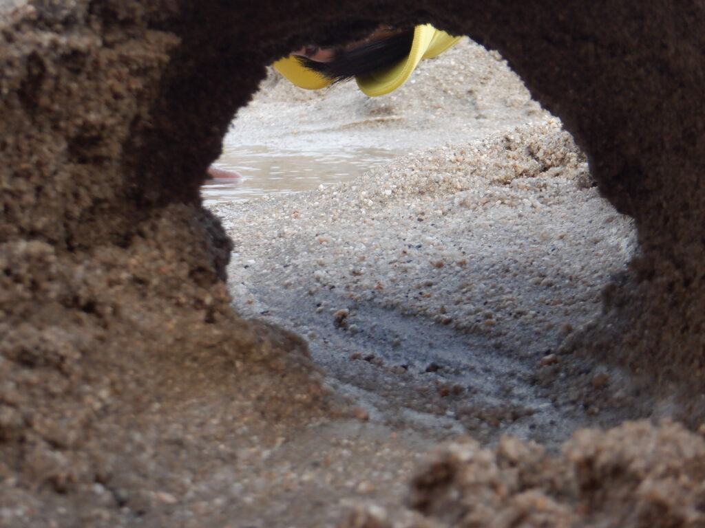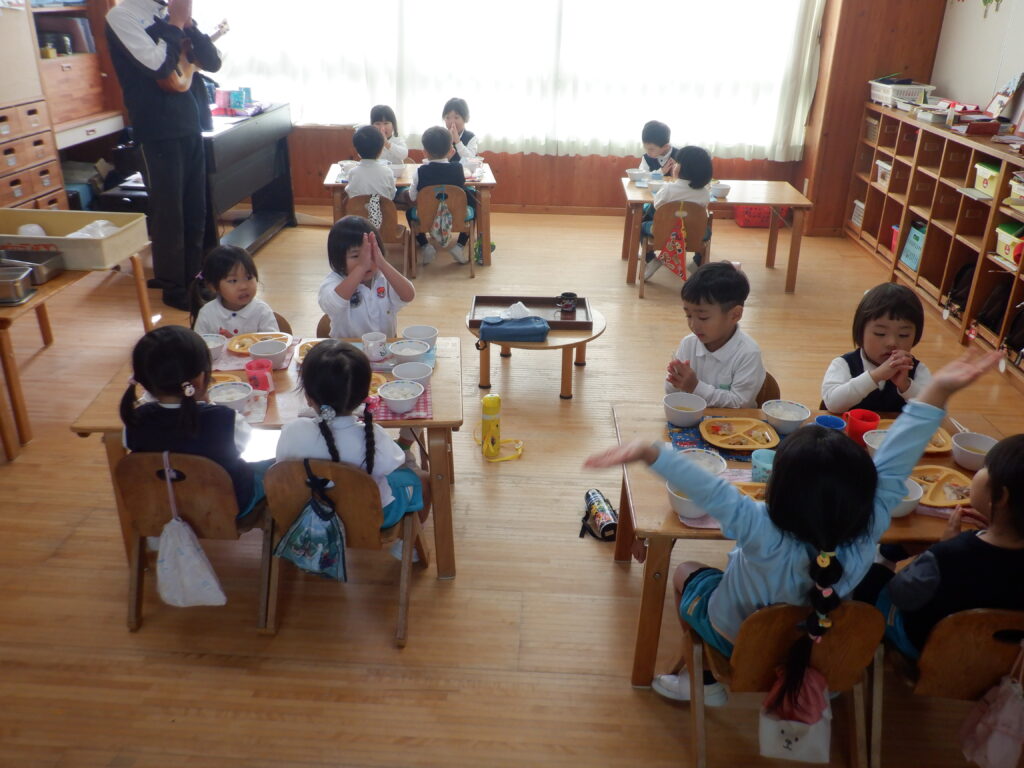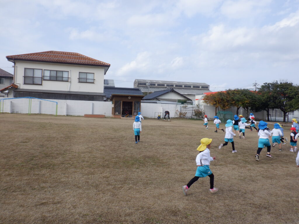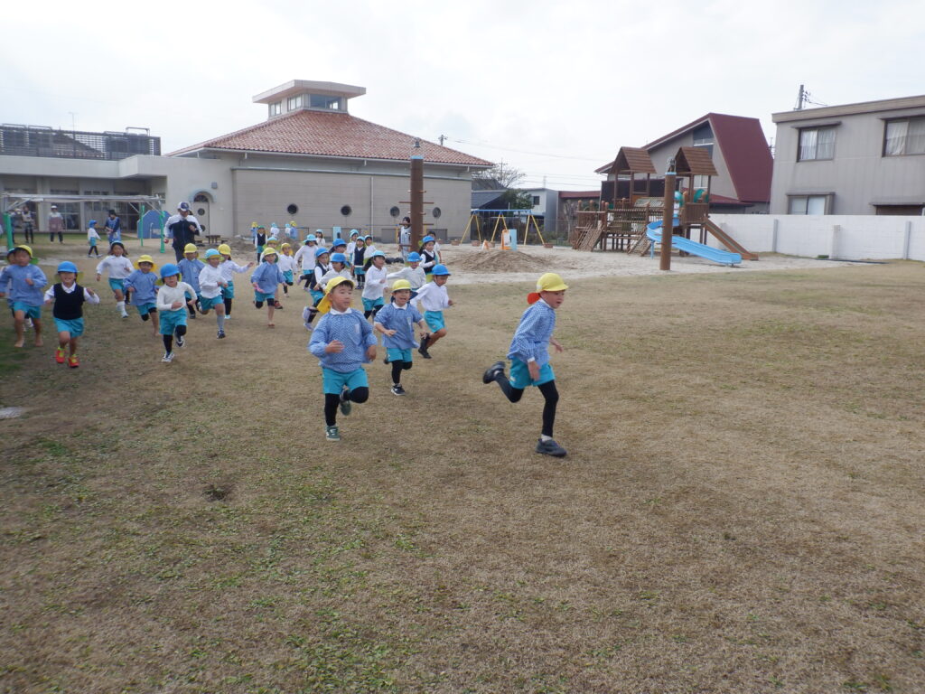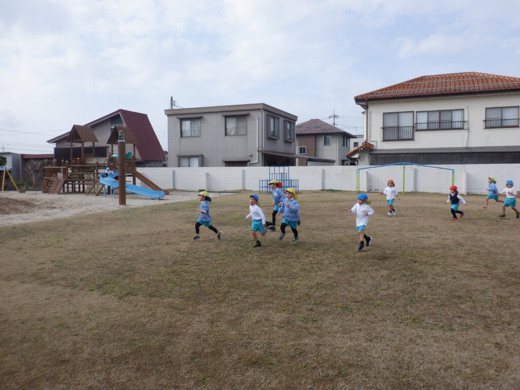 思ったよりも、暖かい日でした。 こんな日は、やっぱり走りたくなります。 まずは、年少クラスがスタート。 しばらくして、後ろから年長クラスが走ります。 さすが年長さん。少しずつ追いつきます。 一緒に走ると、楽しいね。 砂場を見ると、トンネルが残されています。 そおっと、のぞいてみてごらん♩ そおっと、のぞいてみてごらん♪ 楽しそうな笑顔が見えました!! お腹がすいたら、みんなそろって「いただきます!」