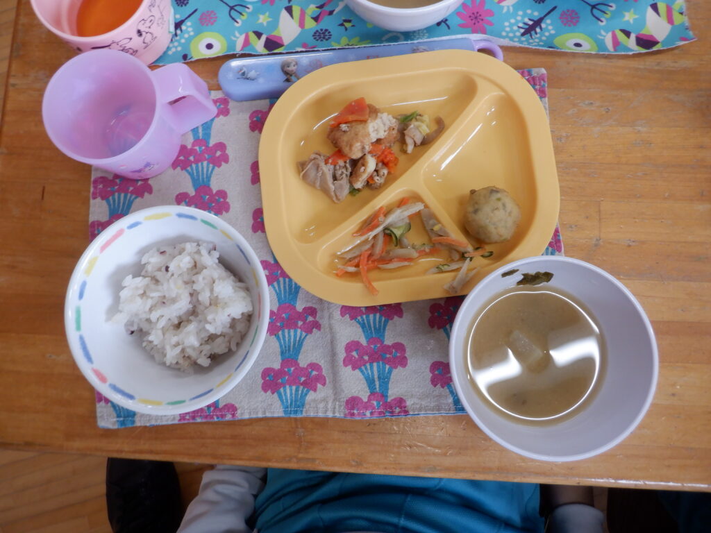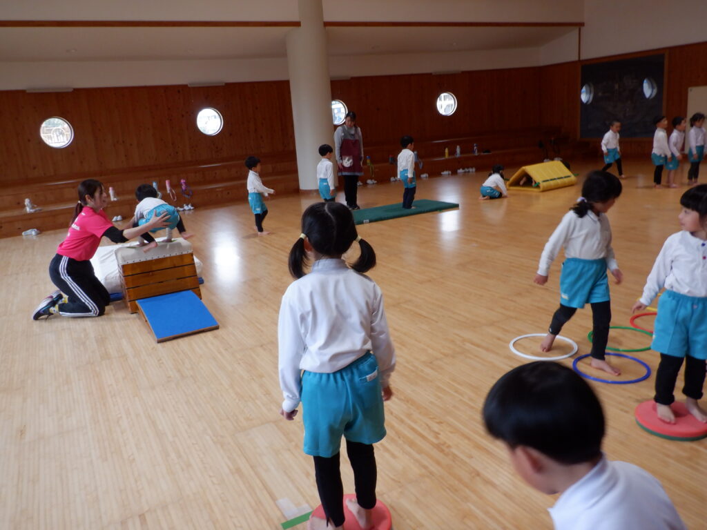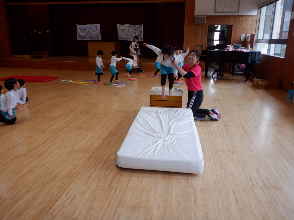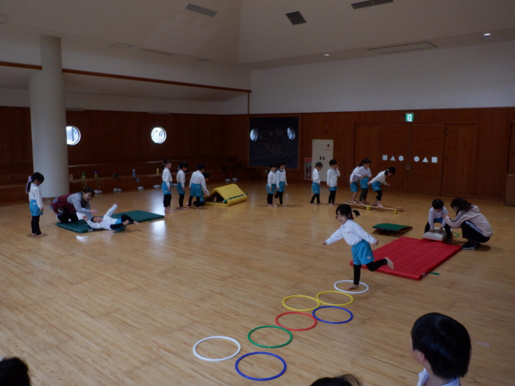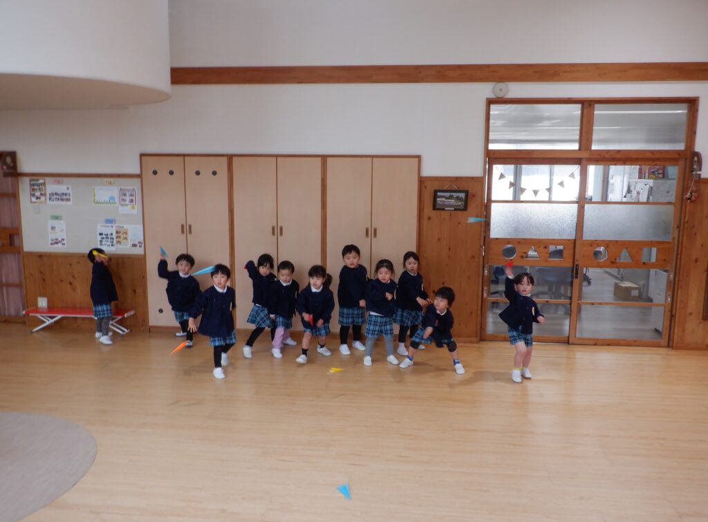 今年度、最後の身体測定です。 みんな大きくなったね。 冷たい風でしたが、みんな元気に外遊び。 ていねいに、ていねいに、ケーキの表面をきれいに仕上げます。 年中クラスの、「うんどうあそび」の時間です。 しっかり体ほぐしをした後で、 いろいろな運動に挑戦です。 大きくジャンプ! 着地も、きれいに決まりました。 今日の給食です。 食後の時間に、飛行機飛ばし大会がありました。 投げるフォームも、かっこよくなってきました。